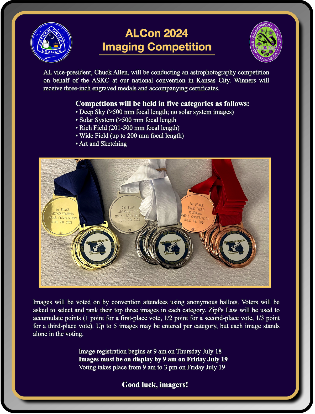 League vice-president, Chuck Allen, will be conducting an astrophotography competition on behalf of the ASKC at our national convention in Kansas City. Winners will receive three-inch engraved medals and accompanying certificates. Here are samples of the medals awarded at a recent regional convention:
