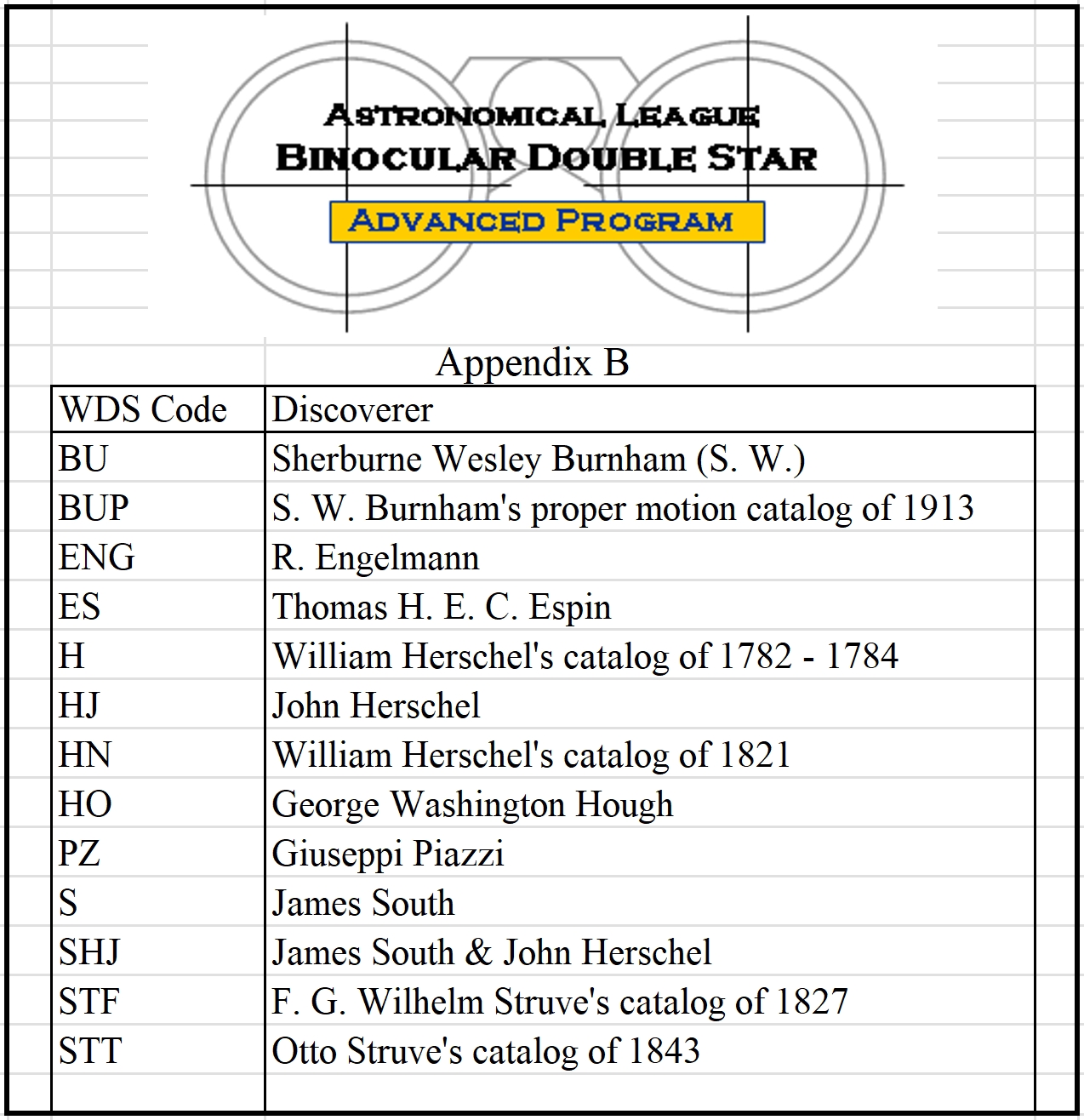 - Appendix A – Advanced Binocular Double Star List (Excel format) (PDF format)
