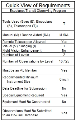 Detecting Exoplanet Transits is exciting! We invite you to take up the challenge! There are ample opportunities for observers to start with the intermediate level and to attain the highest level of achievement over the course of several years. This is one of the few AL observing programs in which you submit your observations to AAVSO as you make them rather than waiting until you have observed the minimum number of objects.