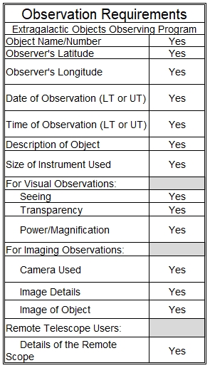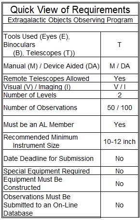 • Observers are required to observe or image a total of any 50 extragalactic objects found within at least 5 host galaxies for a Silver certificate only or any 100 extragalactic objects from at least 10 host galaxies for a Gold certificate and pin. There should be at least 3 different XGO types observed/imaged. If so inclined, the observer or imager may opt to include extragalactic objects from host galaxies not in the list BUT must provide published documentation of these same objects.