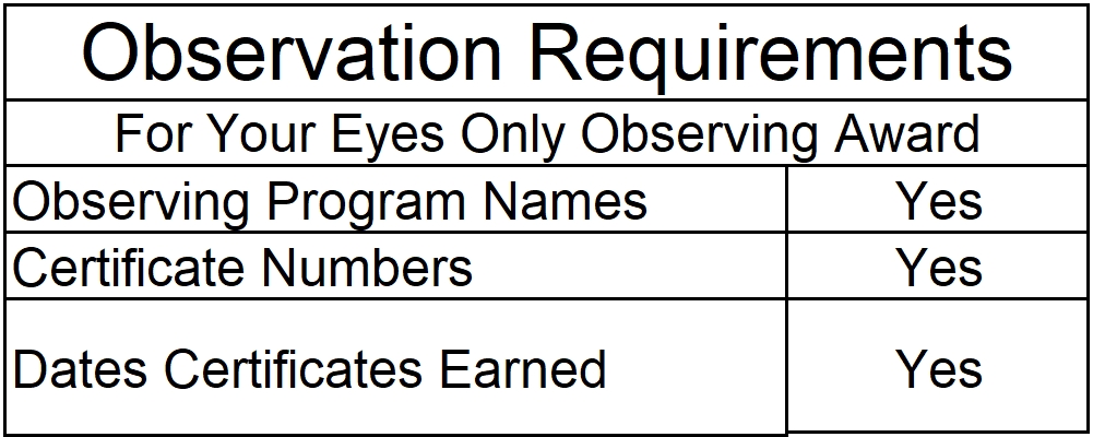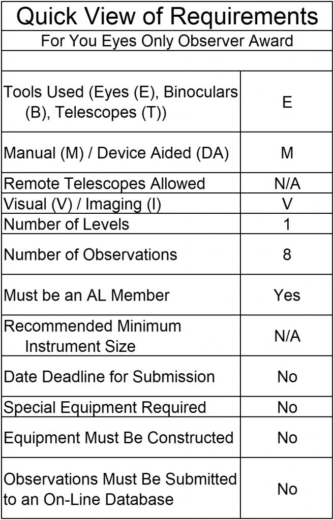 IntroductionAre you new to the hobby of astronomy? Perhaps your have not yet purchased any equipment? Perhaps your interests are based on a desire to just sit out under the skies and take in the wonders of the universe? Perhaps your telescope is getting a bit too heavy to muscle it around? Then this Observing Award is for you. This Observing Award will guide you through the best naked-eye targets in the sky. Requirements and RulesThis certification is available to members of the Astronomical League, either through their local astronomical society or as members at large. If you are not a member and would like to become one, check with your local astronomical society, search for a local society on the Astronomical League Website, or join as a Member-at-Large . The For Your Eyes Only Observer Award will be given to an AL member who has completed at least eight (8) of the League’s eyes-only-based observing programs: