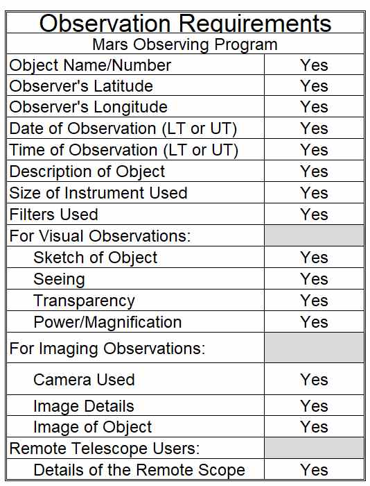 “Negative observations” are valuable — but the observer will be required to document negative observations in the same fashion that he documents positive observations of each phenomenon for which he is looking (e.g., clouds, dust storms, blue clearing). These can be combined with observations of albedo features and polar caps so that the observer will not feel that he or she is wasting time by making repeatedly negative observations. It is expected that an observer will include on the same report form his observations of such features as polar caps, clouds, albedo features, and blue clearing, all of which might be observed on a single night.