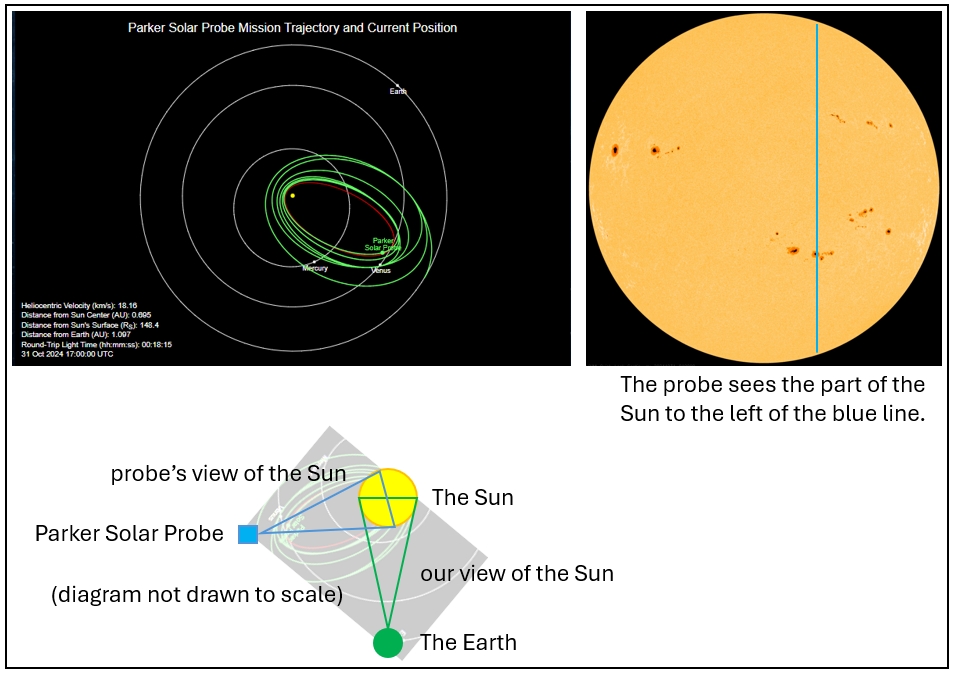 • Using this diagram, the Earth’s location. and the Probe’s location,   Identify what part of your observation is also visible to the probe.  For example, using 10/31/2024 as the date of an observation: